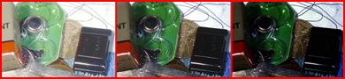 Attached to the camera hot shoe by an inexpensive flash bounce shoe is a Cobra flashgun having a guide number of 20 metres at ISO 100, although any inexpensive flashgun of around this guide number would do. The flashgun is connected to the camera's PC socket by a short PC flash sync lead, and tilted over the front of the lens by adjusting the flash bounce shoe. In order to obtain correct exposures with this set-up, I made a number of test exposures of a group of small objects of varying colour and reflectivity at a range of magnification and lens aperture settings (pictured opposite). The test exposures were then assessed them for correct exposure that would allow me to ascertain the correct lens aperture to use for each magnification (i.e. 1:1, 1:2, 1:3, and 1:5). When taking test exposures it is important to use transparency slide film or digital, as exposure of print film would be corrected at the printing stage.