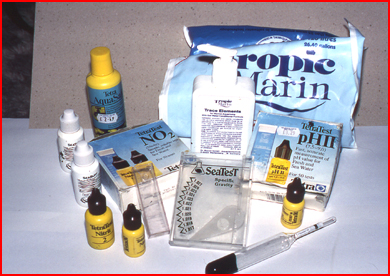 Seawater testing kits (pictured opposite) can be used to make sure that the levels of ammonia, nitrite and nitrate are within acceptable levels. Water salinity is tested using a hydrometer and adjusted by adding salt or fresh water. Water pH (acidity or alkalinity) can be controlled by adding pH buffers. The water is cooled by taking approximately 5 litres of it out each day and freezing it, and then reintroducing the ice back into the aquarium. Nutrients can be replenished by adding them to the water. Seawater is made up from aquarium salt and tap water and then left for a few days to allow any chlorine to escape into the air. Water can be taken from the sea in clean sea areas, however care must be taken as to where the water is taken from. Any pollutants or toxins in the water will be concentrated when in the aquarium. The water is aerated using a couple of powerful air pumps pumping air through wooden blocks.