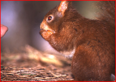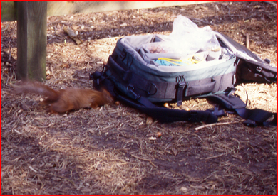 To be I had seen a red squirrel before so off I went over to Brownsea Island in Dorset to try to photograph them. A whole day of walking around the island and I did not even see one never mind photograph one! I heard that there was a reasonable size population of reds in the Freshfield Squirrel Reserve at Formby Point in Merseyside, so off I went to investigate, camera gear and a couple of bags of hazel nuts in hand. I could not believe my eyes, one of Britain’s rarest mammals and they were everywhere, including sitting in my camera bag and hanging from my coat pocket, both locations of my bags of nuts. The photographs opposite show a red squirrel about to climb into my camera bag to retrieve some hazel nuts, and one I fed by hand as I took a photograph of it.