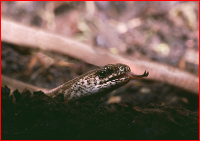 Many times I had seen Slow-worms in the compost heap at the end of my garden. I had tried to get a few shots of them in situ, but obtained nothing special. I then cut down a cardboard box and recreated a compost heap in it in the middle of my kitchen floor. I then placed a Slow-worm in the set and let it settle for a short while. Then by laying on the floor with my camera, I was able to achieve some low angle shots, but again nothing particularly special. I noticed that the Slow-worm was occasionally tasting the air, which gave me the idea of spraying the air in front of it with a houseplant water mister bottle. This did the trick, and the Slow-worm began to taste the air more frequently, its tongue only out for a split second at a time. After several rolls of film I got my shot and the Slow-worm was returned to the compost heap at he end of my garden. |